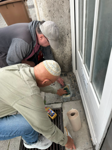 August 24, 2025, Steve Moritz, grandson of Maximilian and Hermine, joined by his wife Sarah, son Josh and daughter-in-law Carly, shines their Stolpersteine.