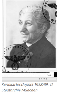 Möbelhändlerin, geboren am 27.03.1871 in Wien, Österreich, verwitwet, deportiert am 04.06.1942 aus München nach Theresienstadt, ermordet am 06.08.1942 in Theresienstadt (23.Tammuz 5702)